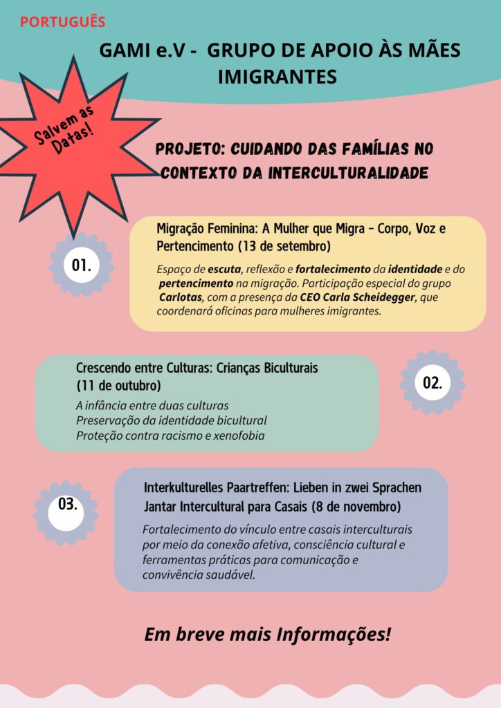 O GAMI – Grupo de Apoio a Mães Imigrantes tem o prazer de compartilhar que o projeto “Famílias Fortalecidas no Contexto da Interculturalidade e Migração” (Gestärkte Familien im Kontext von Interkulturalität und Migration) foi oficialmente aprovado para financiamento pelo Departamento de Integração da Prefeitura de Oldenburg. Esta iniciativa, criada em 2023, busca oferecer apoio emocional e social às mães que vivem a experiência da maternidade em contexto migratório, fortalecendo famílias interculturais, especialmente aquelas compostas por brasileiras e alemães.